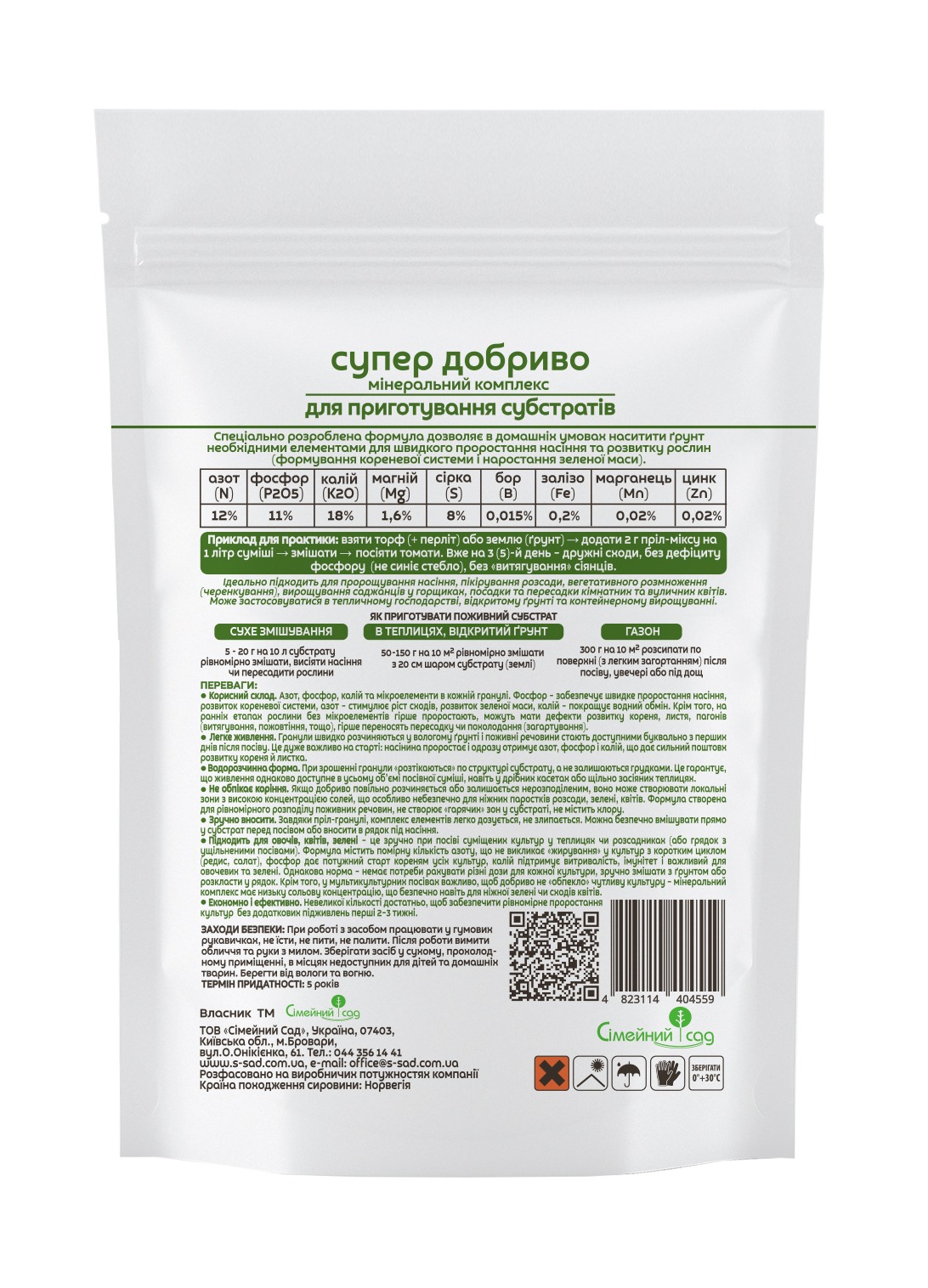 Спеціально розроблена формула дозволяє в домашніх умовах наситити ґрунт необхідними елементами для швидкого проростання насіння та розвитку рослин (формування кореневої системи і наростання зеленої маси).